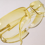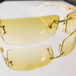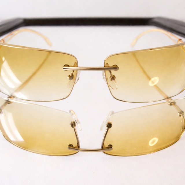 These rimless-style sunglasses feature soft yellow gradient lenses
