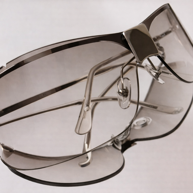 넓은 쉴드형 렌즈가 적용된 스타일리시한 선글라스로, 얼굴을 자연스럽게 감싸주는 곡선 실루엣이 세련된 분위기를 연출합니다.