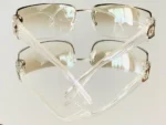 These sunglasses feature a design that combines a transparent frame with round rimless lenses, creating a soft and refined daily style.